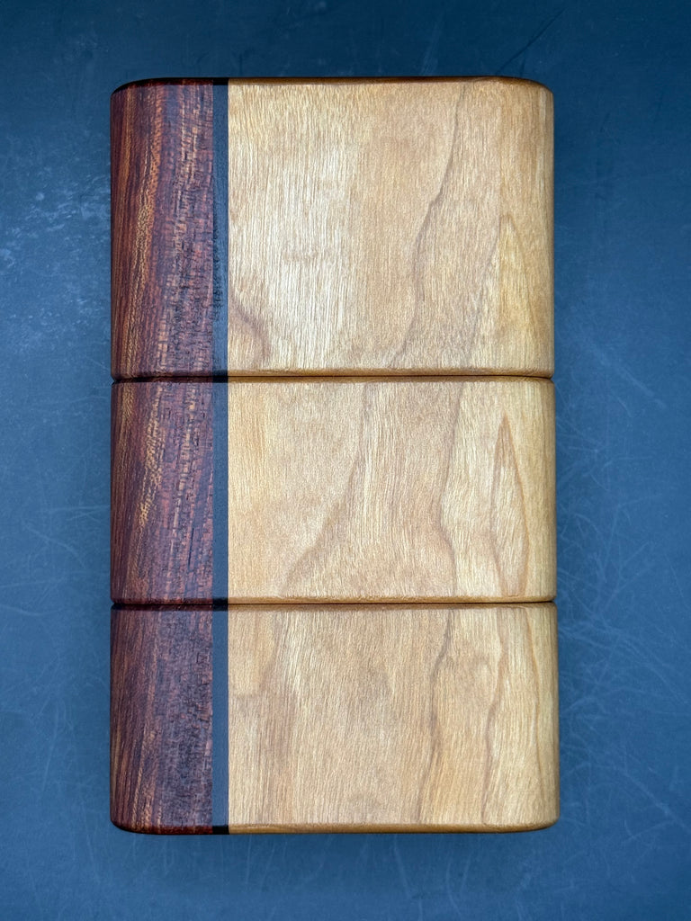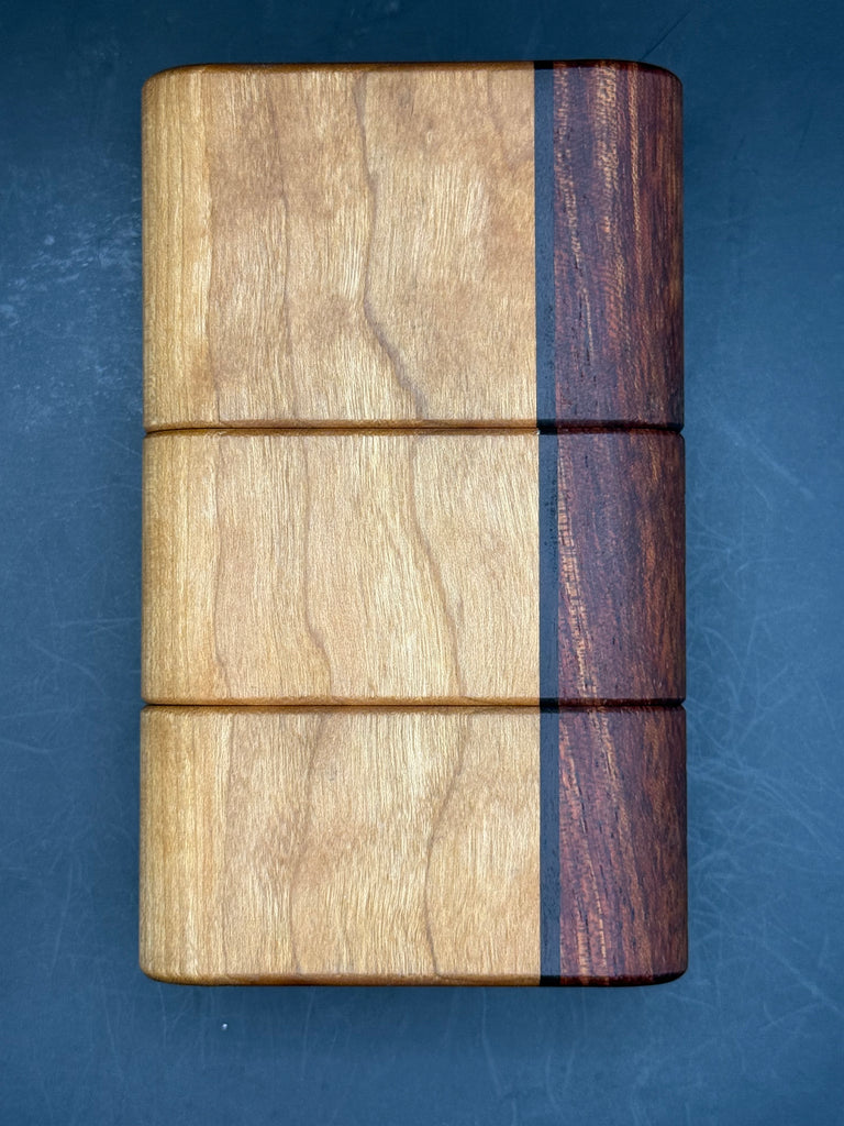 Cherry with bubinga and a thin piece of Bolivian rosewood, comes with a Bolivian rosewood toker and clear augmented glass.